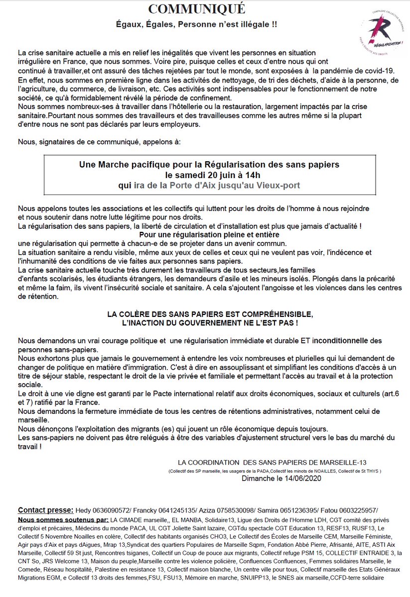 Communiqué de la coordination des Sans Papiers de Marseille.